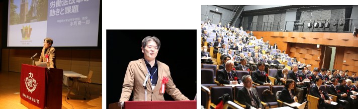 第2部 記念講演 第2部記念講演は、同会場にて杉山秀文副会長(東京会)の司会のもと行われ、水町勇一郎先生を講師として「労働法改革の動きと課題」との演題のもとご講演いただきました。ご講演後、質疑応答を経て、曽布川哲也副会長(東京会)の閉会の辞をもって終了し、その後ステージ上から出席者全員の記念撮影が行われました。