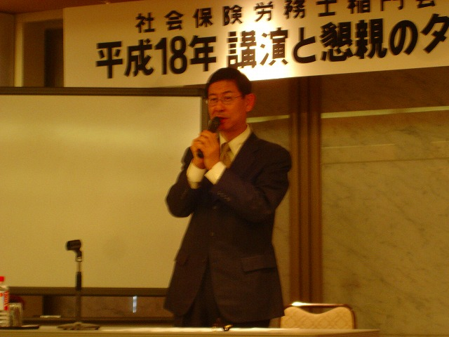 2006年12月2日(土)午後3時より、「神楽坂エミール」にて、会員38名の参加のもと「第6回講演と懇親の夕べ」が開催されました。2001年7月に社会保険労務士稲門会が設立され、その年に第1回の「講演と懇親の夕べ」を催してから今年で6回目の開催となりますが、今回は初めて母校から現役の法学部(法科大学院)教授を講師にお招きすることができ、また時宜を得た講演テーマでもあったことから、他大学社労士会の方々にも積極的にご参加いただき、盛況のうちの開催となりました。