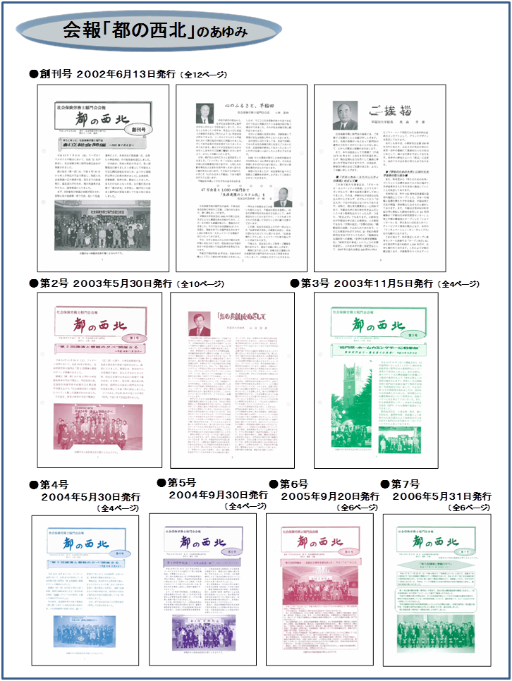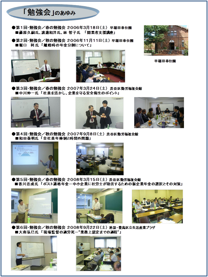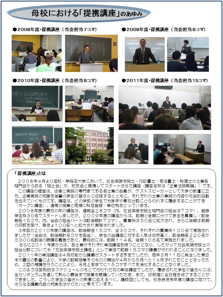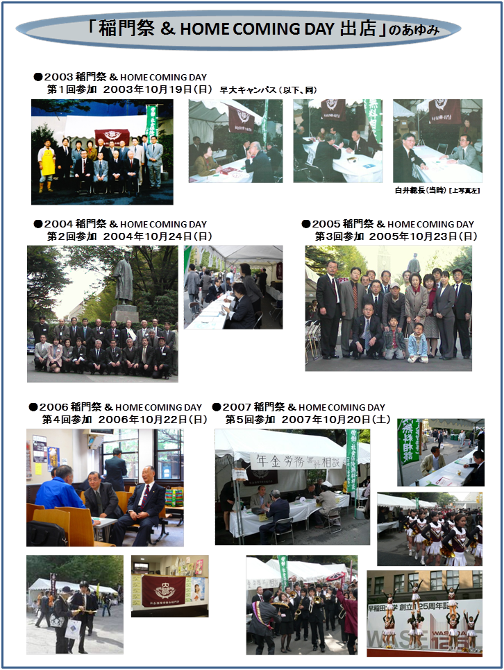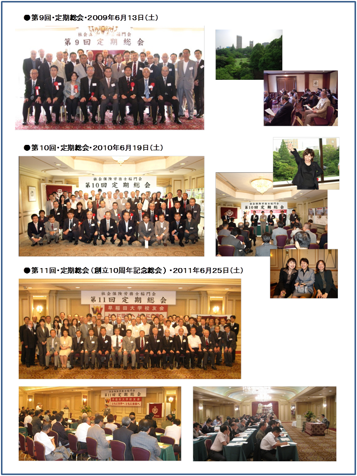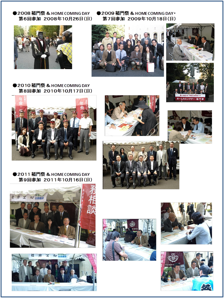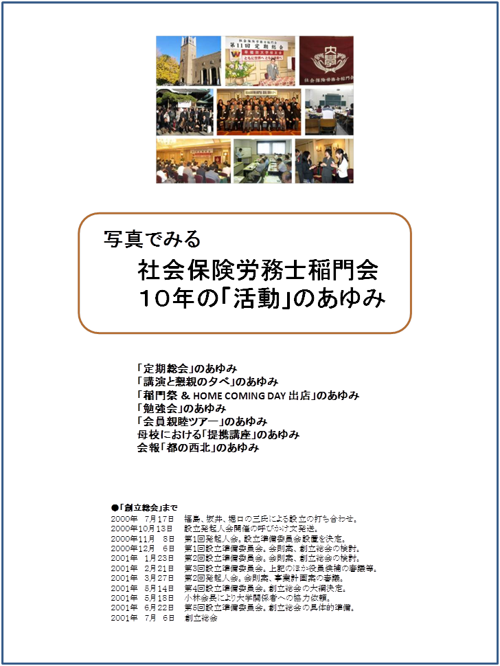 社労士稲門会10年の「活動」のあゆみを、定期総会、講演と懇親の夕べ、稲門祭&HOME COMING DAY、勉強会、会員親睦ツアー、提携講座、会報「都の西北」発行の順に、各イベントごとに写真で時系列にまとめてあります。