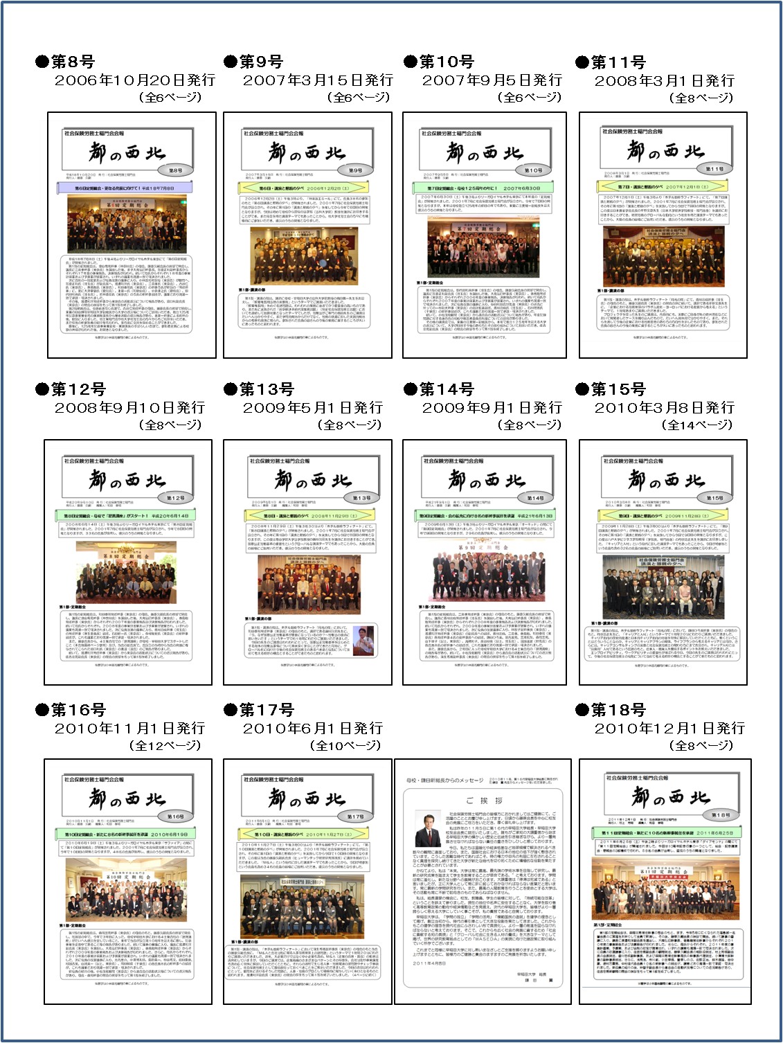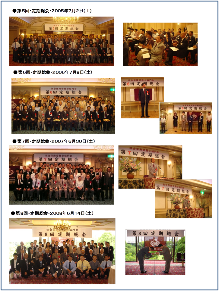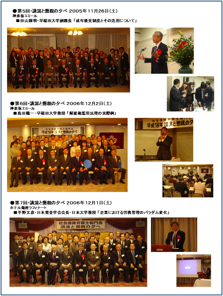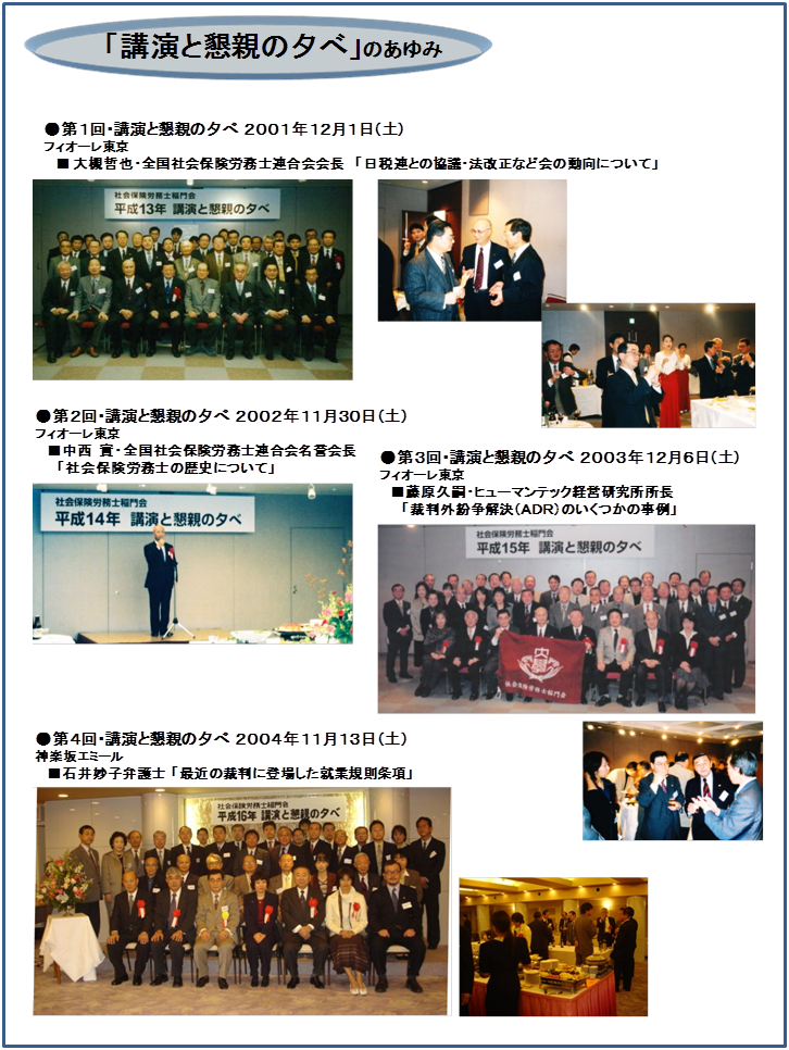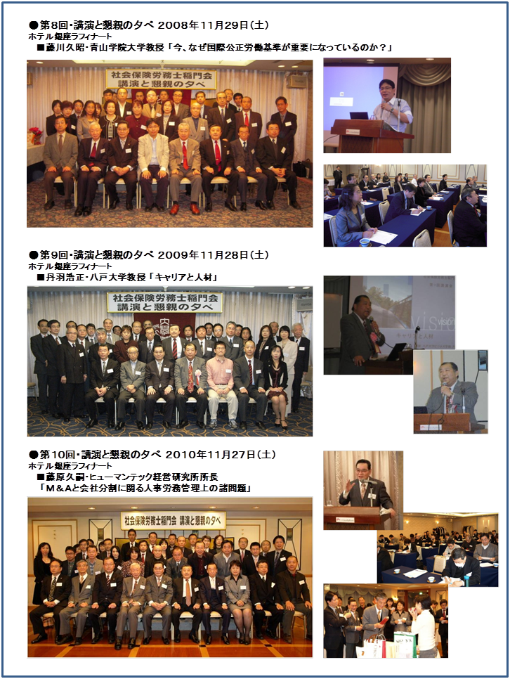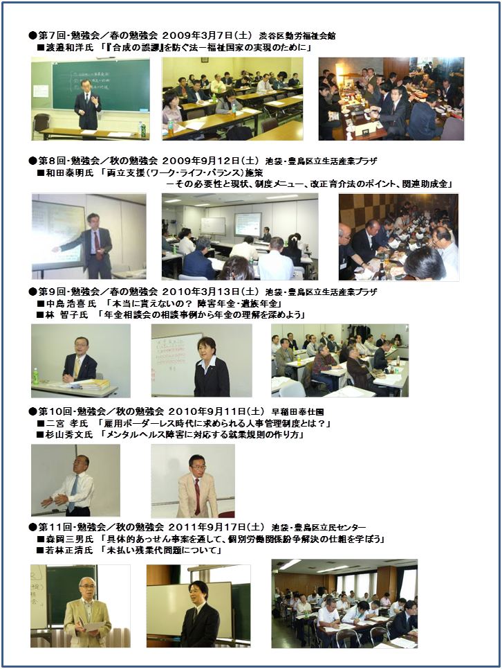 社労士稲門会10年の「活動」のあゆみを、定期総会、講演と懇親の夕べ、稲門祭&HOME COMING DAY、勉強会、会員親睦ツアー、提携講座、会報「都の西北」発行の順に、各イベントごとに写真で時系列にまとめてあります。