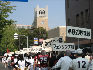 今回のホームカミングデーの実行委員長は、中日で活躍した谷沢健一氏。体育各部の校友が、当時のユニフォームで応援部員とチアガールの先導のもと大隈講堂へ向けパレードを行い、校友アスリート握手会にはマラソンの瀬古利彦氏やスキー部OBの荻原健司氏も出席していました(約8,000人の人出)。